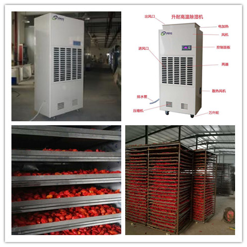 一般冷凍式排濕機的工作環境溫度為5-38℃,超過38℃排濕機將實施自動保護而停機。但在物料干燥室,烘干房內,其室內溫度一般超過40℃,所以一般的冷凍式排濕機無法在此環境下工作。現在一般企業的物料干燥方法是將干燥室,烘干房內濕熱空氣通過風機強行外排。這樣,室內的熱量也隨之排出室外。現已在全國各地的工廠企業烘干房內推廣使用,其效果也得到了所有用戶的認可。