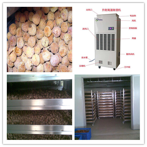 要想把桂圓制作成干果,方法有很多,不用花錢的就是自然晾曬,不過這需要大的場地,而且還需要也要看天氣情況,因此龍眼干的產量及品質得不到保證,因此以烘干為主。烘干有傳統的土爐烘干,土爐烘干使用柴火或者煤炭升溫加熱,溫度不易控制,不但存在安全隱患,環保問題也不小,因此慢慢被淘汰了,取而代之的是桂圓烘干除濕機。